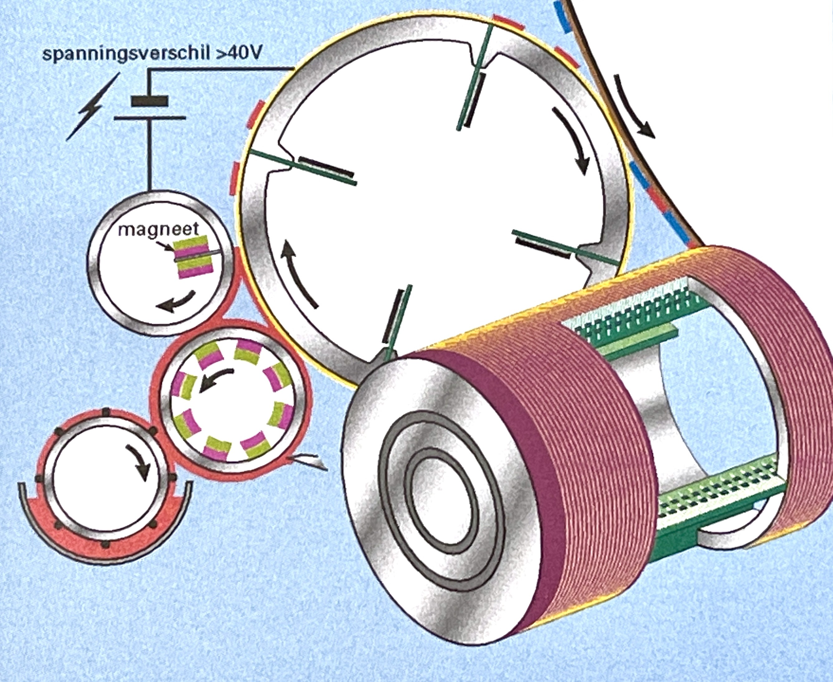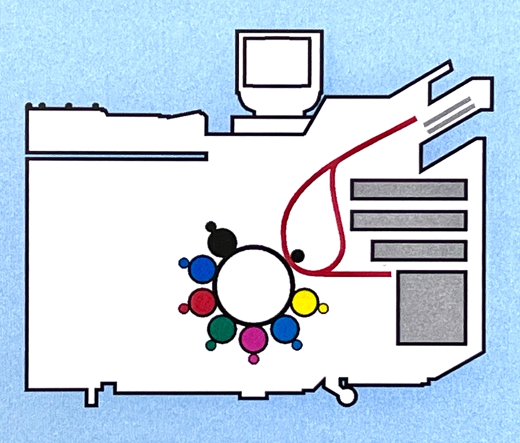 imaging”. Hierbij werd geen gebruik meer gemaakt van een oplaadbaar master en van licht, maar werd gekleurde toner direct ontwikkeld op een van elektroden voorziene wals. Een aantal van zulke walsen zijn opgesteld rondom een trommel, die het verzamelde tonerbeelden samengesteld overzet op ontvangstpapier.
